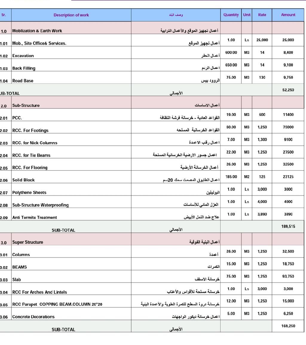 Civil Engineer, Quantity Survey, 6 years of experience in the country. I prepare BOQ. The price of The Villa is 150 dirhams (inventory and pricing) the price of the building is 700 dirhams (inventory and pricing) To contact