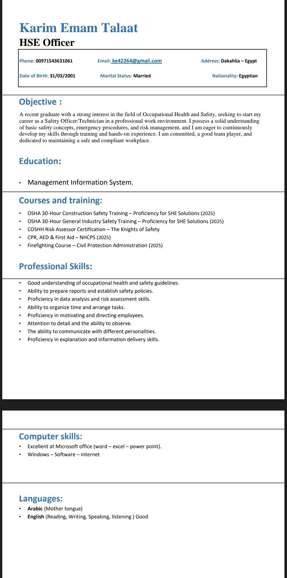 My name is Karim, and I am looking for a job in the safety field. I graduated with a degree in Management Information Systems and have completed safety courses. I need a job opportunity and I have a work visa