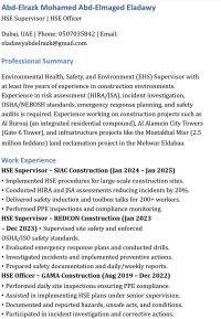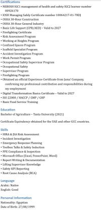 HSE Officer/ Safety Officer Agriculture Graduate - UAE Degree Equivalency 5 years of experience in Egypt NEBOSH - IOSH - OSHA certified Available for immediate employment in the UAE