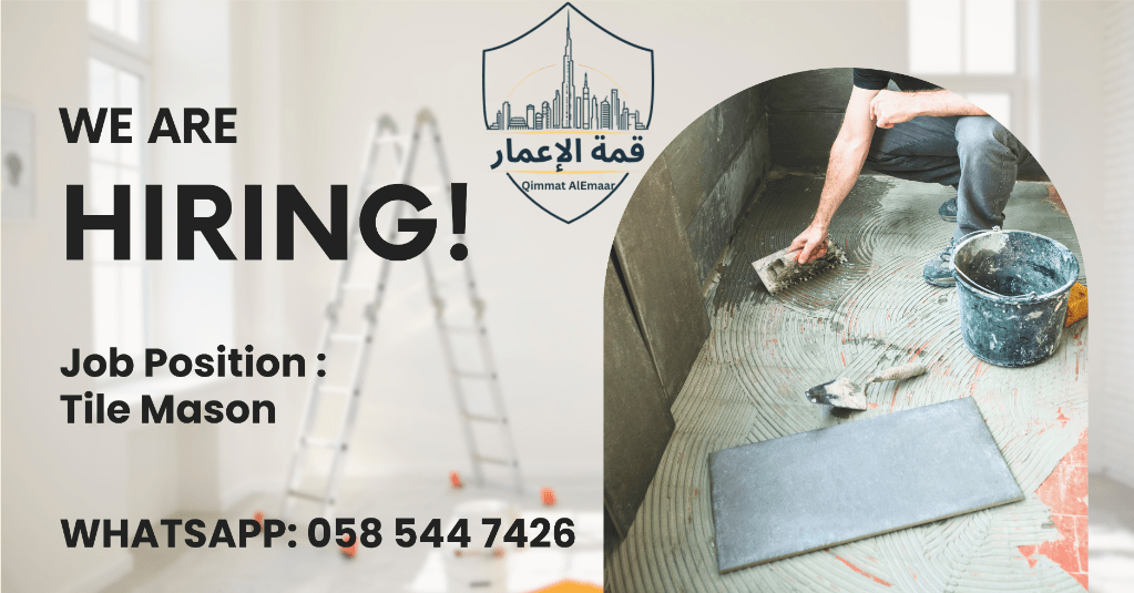 Tile Masons - Immediate Joining We are looking for skilled Tile Masons to join our team in Al Muteena, Dubai, UAE. Requirements Minimum 2 years UAE experience in tile fixing. Candidates with own visa are preferred. Can join immediately. Job Type full time Salary AED1200 - AED2500 per month (based on experience and skill level) How to Apply