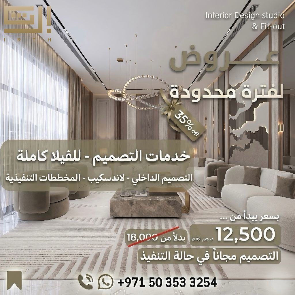 شركة إرث العمارة للتصميم وجهتك لتصميم معماري متكامل من الفكرة حتى التسليم، مع تنفيذ وتشطيب كامل (Full Fit - Out) وتصميم داخلي وخارجي وحدائق باحترافية عالية. نراجع المخططات ونطورها بأفضل المعايير. عروض خاصة لفترة محدودة ابدأ مشروعك بثقة تواصل معنا الآن