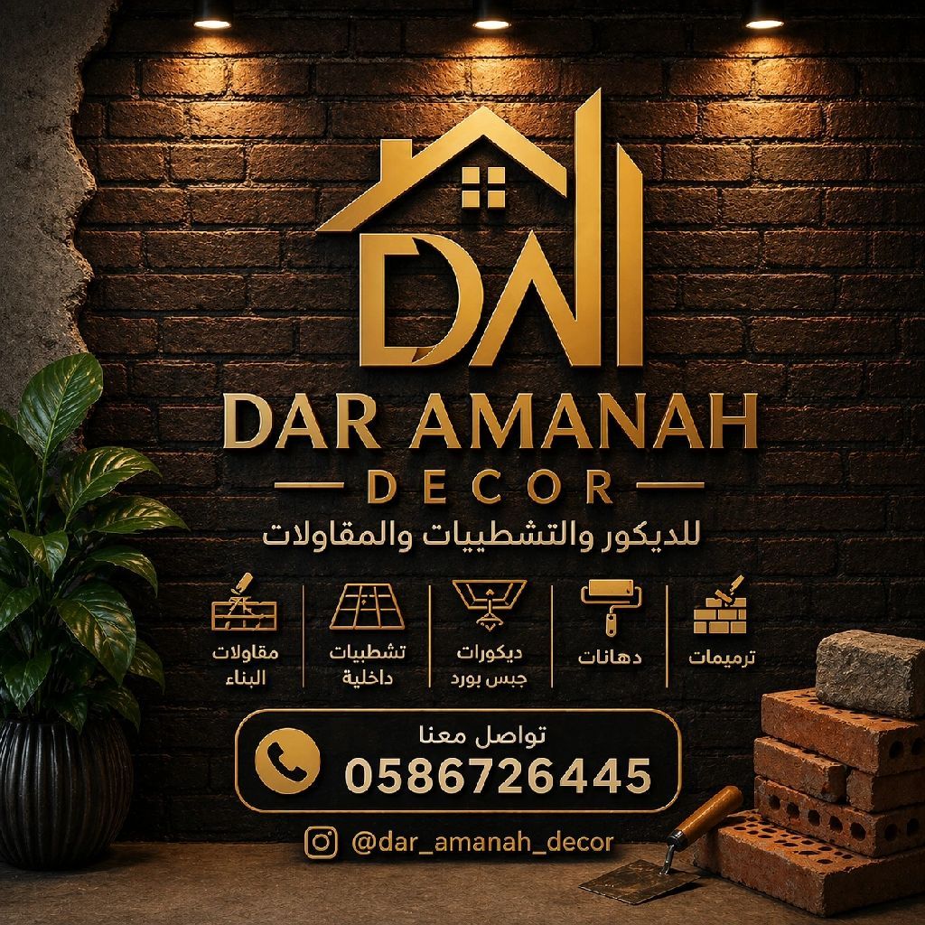 متابعة الصفحة أهم خطوة لو بتدور على شغل تشطيب يشرف. نحن في الدار أمانة للتشطيبات والديكور نقدم لك شغل احترافي من أول لمسة لحد التسليم. دهانات عصرية، جبسون بورد بأحدث التصميمات، تشطيب كامل بجودة عالية، التزام بالمواعيد. هدفنا إن بيتك يطلع أحلى من اللي في خيالك. للتواصل في الفجيرة والامارات، تاب عنا وشوف شغلنا بنفسك (صور حقيقية من أرض الواقع)