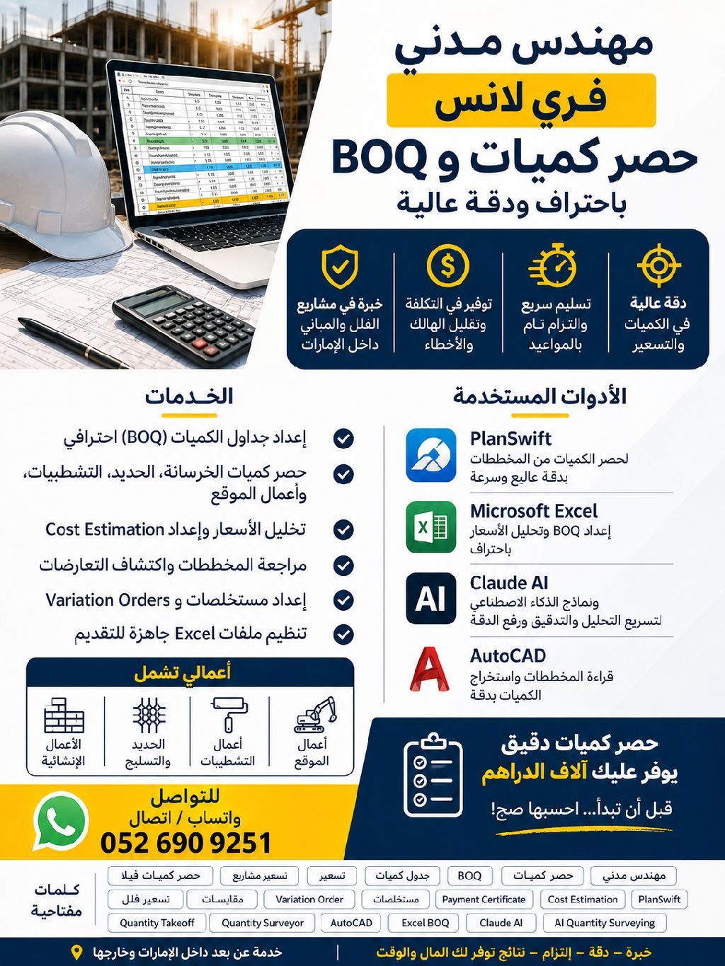 مهندس مدني Freelance لحصر الكميات والتسعير في الامارات (فلل ومباني) الخدمات اعداد BOQ وتسعير دقيق (Cost Estimation) حصر الخرسانة، الحديد، والتشطيبات بدقة عالية. واستخدام أحدث السوفت ويرز مراجعة المخططات، Variation Orders، ومستخلصات. تقارير Excel احترافية المميزات دقة تمنع الهالك، سرعة تسليم، خبرة بمشاريع الدولة، وأسعار تنافسية. للتواصل (واتساب / اتصال)