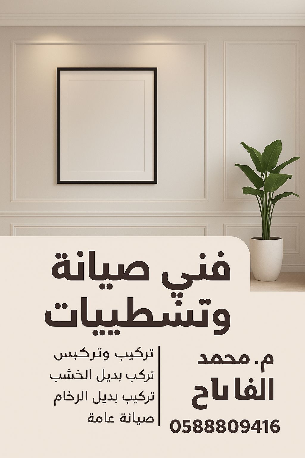 صيانة وتشطيب - خبرة وجودة نقدم جميع خدمات التشطيب والصيانة بخبرة عالية وجودة مضمونة تركيب الجبسون بورد تركيب بديل الخشب تركيب بديل الرخام تشطيبات داخلية كاملة صيانة عامة للشقق والفلل نستخدم أفضل المواد ونعمل بسرعة ودقة، مع أسعار مناسبة وجودة تليق ببيتك أو مشروع. م محمد الفاتح