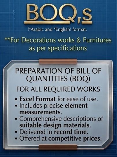 Save your time and manual effort We provide professional Bill of Quantities (BOQ) services specialized in interior decorations works and furniture, ensuring 100% accuracy. What We Offer Precise engineering take - offs for all finishing and furniture items. Detailed Excel sheets including measurements and technical specs. Comprehensive descriptions of materials suitable for your design