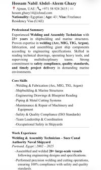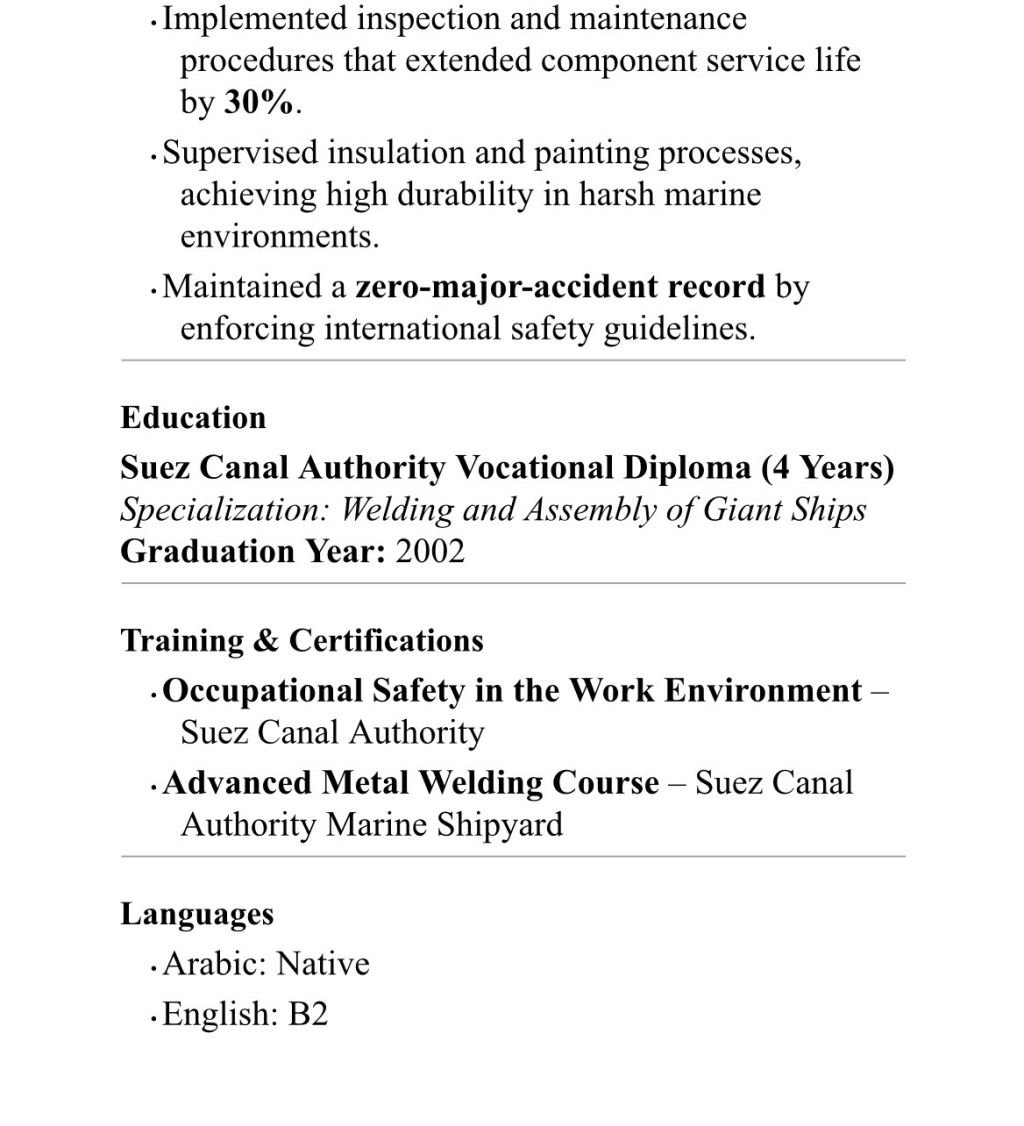 فني بناء سفن أول ممتاز تخصص بناء واصلاح وصيانة ولحام وقص باللمبة وتنظيف الألواح المعدنية وقراءة الرسم الهندسي وتنفيذه خبرة 22 عام بالعمل في هيئة قناة السويس والأحواض الجافة بالتراسانة البحرية شاركت في بناء أكثر من 20 سفينة عملاقة بتراسانة بور سعيد البحرية القدرة علي قيادة فريق كامل بالعمل الميداني وتسليم المشروعات في موعدها المحدد مع المحافظة علي السلامة المهنية