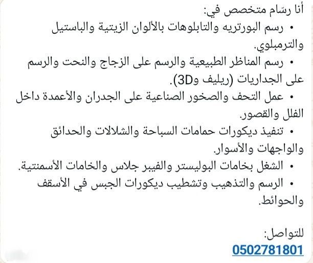 Specializing in portraiture and paintings in oil, pastel, and trampoline, as well as landscape painting, glass painting, sculpture, mural painting (relief and 3D) and the creation of artificial rocks and decorative elements for walls and columns inside villas and palaces. Also specializing in the decoration of swimming pools, waterfalls, gardens, facades, and fences using polyester, fiberglass, a