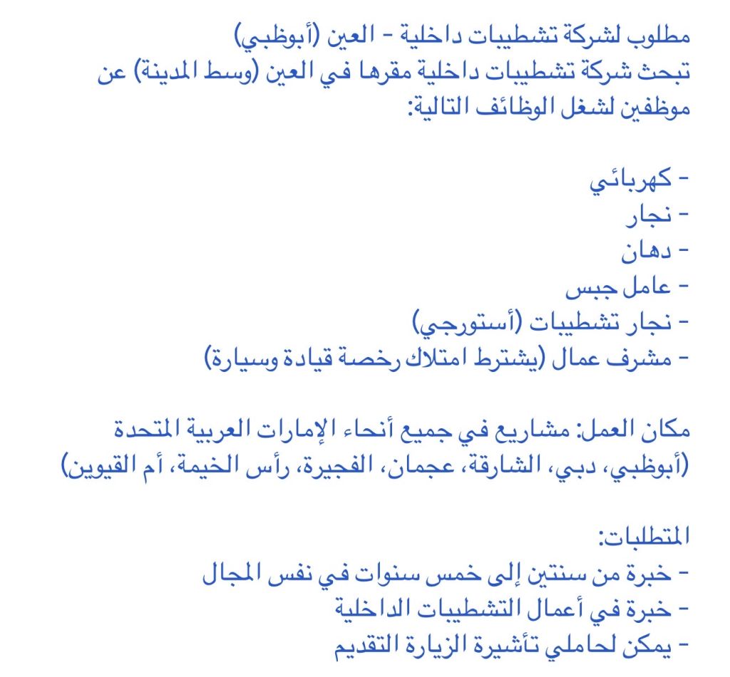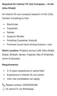 مطلوب للعمل داخل شركة مقر الشركة في أبوظبي - مدينة العين - وسط المدينة - الشارع العام - سباك ومساعد نجار ومساعد نقاش ومساعد صنايعي جبس ومساعد فورمان يتوفر معه ليسن وسيارة لشركة تنفيذ ديكور الموقع جميع امارات الدولة (أبوظبي، دبي، الشارقة، عجمان، الفجيرة، رأس الخيمة، أم القيوين) المتطلبات خبرة لا تقل عن 2 - 5 سنوات في نفس المجال يسمح لمن هم حاملين فيزا زيارة