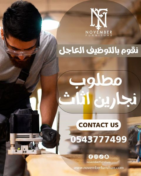 مطلوب نجارين موبيليا محترفين لمصنع نوفمبر في الشارقة الصناعية 4. يشترط الخبرة العالية في تصنيع المجالس، طاولات الطعام، الدواليب، والدريسنج روم، والطاولات بكافة أنواعها. يجب اتقان التعامل مع الماكينات والعدد اليدوية والالتزام بدقة التشطيب ومواعيد التسليم. رواتب مجزية تحدد بعد الاختبار. للتقديم يرجى التواصل اتصال