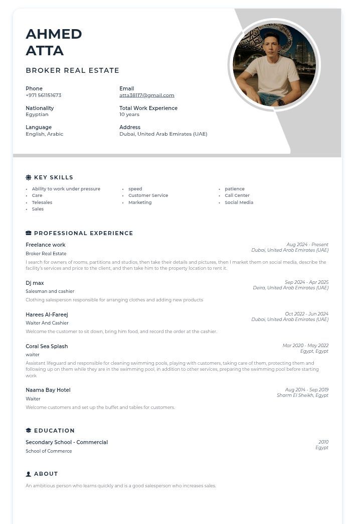 اسمي أحمد عطا من مصر مؤهل متوسط ثانوي تجاري عندي خبرة 3 سنين في دبي الامارات اشتغلت وايتر وكاشير في مطعم أكل عربي عندي خبرة في المبيعات وفي محل ملابس بائع وكاشير أيضا اشتغلت في مجال السياحة في مصر أتحمل العمل تحت ضغط وأتعلم سريعا لغتي الانجليزية متوسطه تحدث وكتابة وقراءة