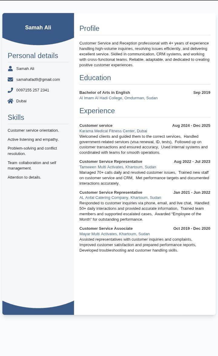 موظفة خدمة عملاء واستقبال بخبرة أكثر من 4 سنوات في التعامل مع العملاء، الرد على المكالمات، تنظيم المواعيد، واستخدام أنظمة CRM. خبرة في العمل داخل المراكز الطبية والخدمية، والتعامل مع المعاملات الحكومية. أجيد التواصل، حل المشكلات، والعمل ضمن فريق. جاهزة للعمل فورا داخل دبي. الموقع دبي للتواصل