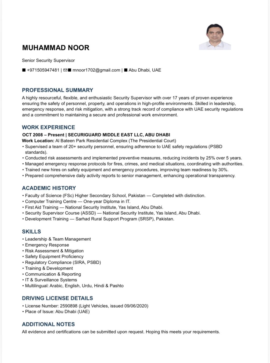 Looking for a job opportunity. Working as a security supervisor with over 17 years of proven experience (UAE)
