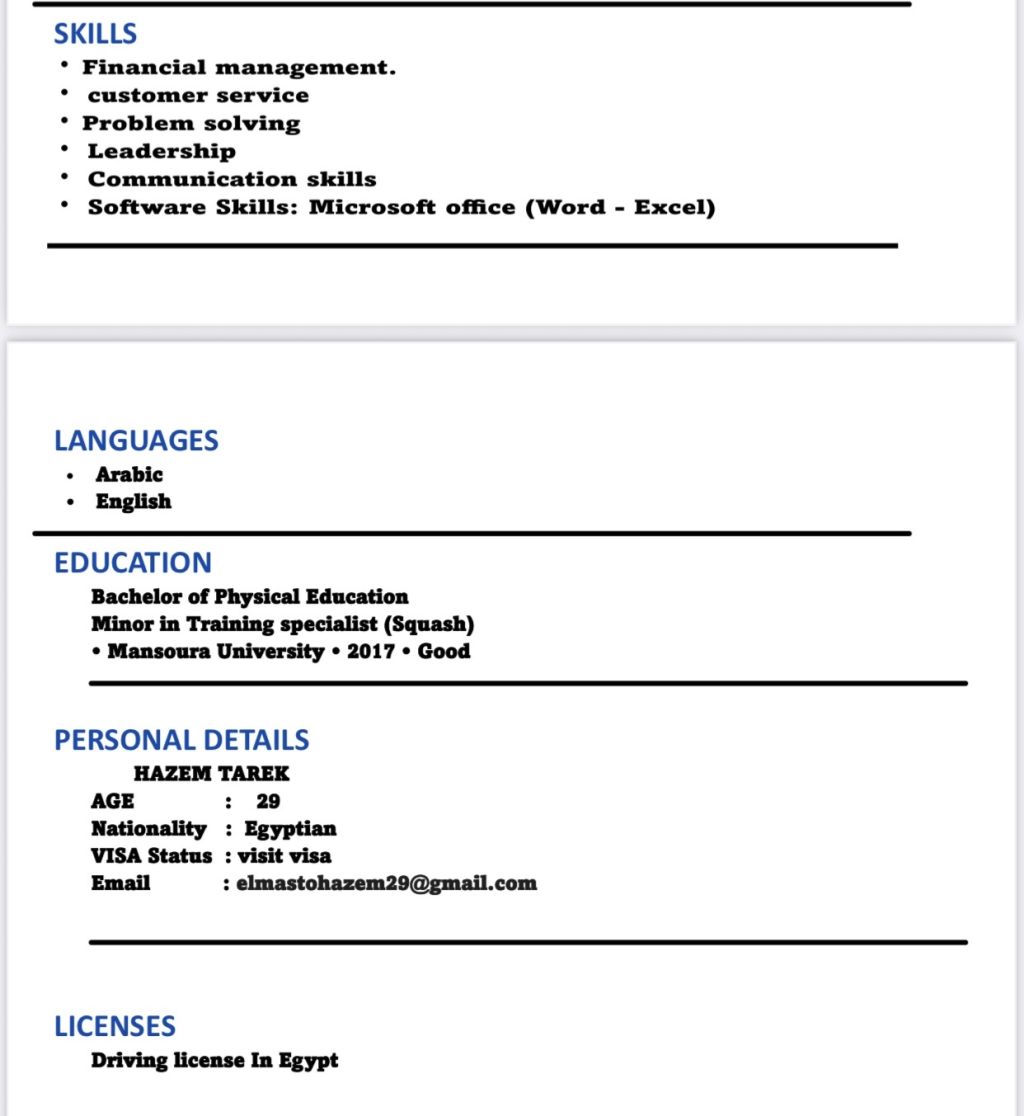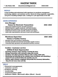 Hazem Tarek, 29, Egyptian, looking for a job opportunity in the UAE. Cashier, sales, customer service, store keeper. Experienced in Damen Electronic Transactions Company, textile warehouse management, and working as a cashier in a hypermarket. Skilled in customer service, inventory control, and POS systems. Fully available to join immediately
