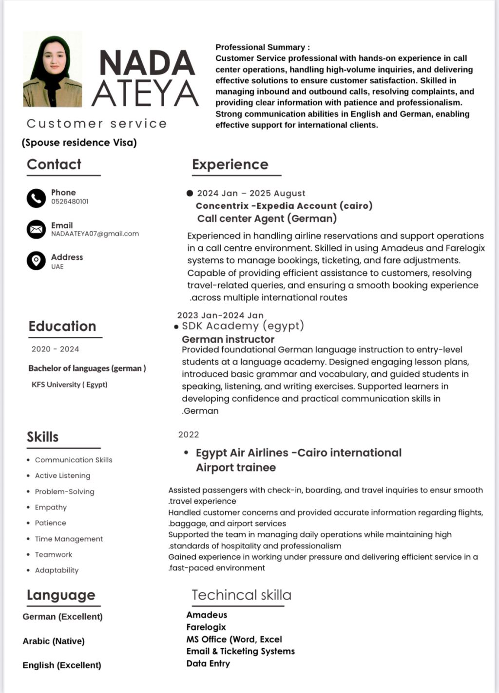 An English, Arabic and German speak with two years visa seeking opportunity to work in UAE
