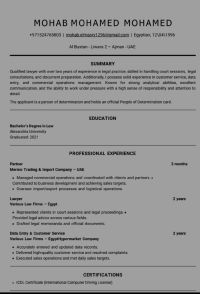 Mohab Mohamed يمتلك خبرة في المحاماة، ادخال البيانات، وخدمة العملاء، اضافة الى عمله شريكا في شركة تجارية في الامارات. يتميز بمهارات قوية في التواصل، التحليل، وإدارة المهام، ويستطيع العمل بكفاءة في الوظائف القانونية والادارية