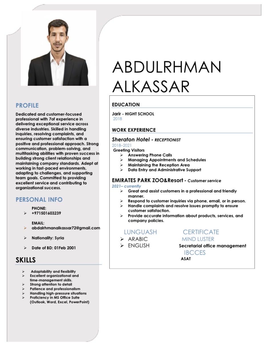 I am currently looking for a job opportunity in Reception, Customer Service, or Administrative Support. I have strong communication skills, excellent customer - handling abilities, and experience in managing daily office tasks. I am professional, organized, and able to work under pressure while maintaining a positive attitude. UAE