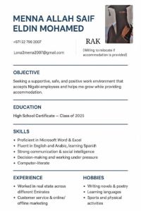 An 18 - year - old Sudanese girl seeking employment in any permissible field ( I will not accept modeling positions due to the niqab) has experience in customer service reception marketing real estate travel and tourism and I speaks Arabic and English and is learning Spanish and im willing to work in any emirate outside of Ras Al-Khaimah if accommodation is provided