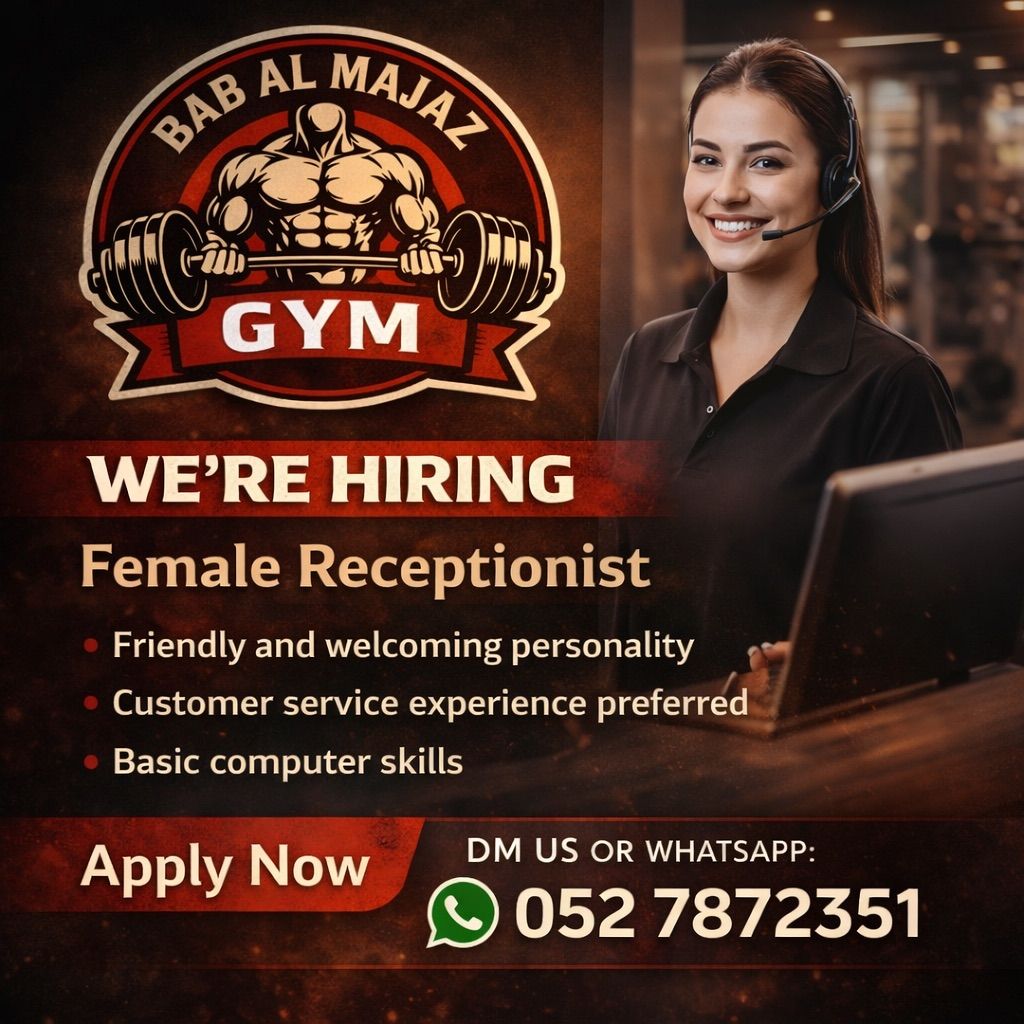 Female Receptionist Needed - Gym in Sharjah Requirements Good English (Arabic is a plus) Friendly personality and good customer service skills - Basic computer knowledge - Previous customer service experience is preferred For contact via