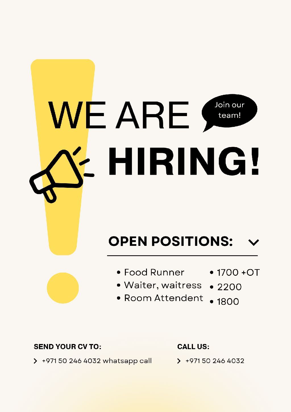 We are hiring motivated and hardworking individuals to join our hospitality team. Multiple positions are available with competitive salaries and, in some roles, overtime benefits. Candidates must be ready to work in a dynamic environment and deliver excellent service to guests al qusmiya Dubai
