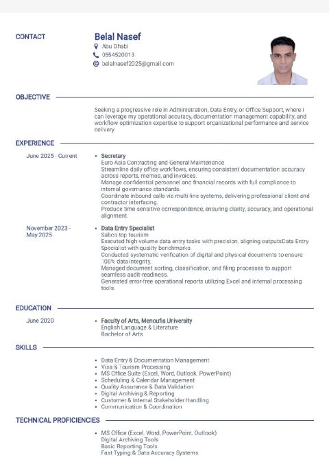 متخصص اداري ومدخل بيانات بخبرة قوية في إدارة الوثائق، ضمان دقة البيانات، تنسيق العمليات المكتبية، واعداد التقارير. متمرس في برامج مايكروسوفت، الأرشفة الرقمية، وتنظيم الجداول، مع قدرة عالية على التعامل مع أحجام عمل كبيرة بموثوقية وكفاءة داخل بيئات تشغيل سريعة