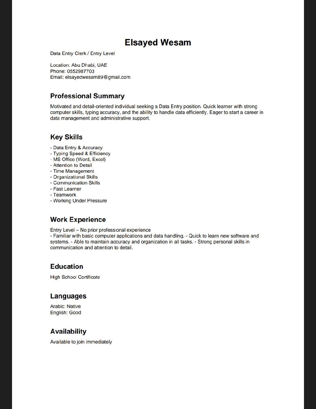 مدخل بيانات يتمتع بالدقة والتركيز العالي، لديه القدرة على ادخال وتحديث البيانات بسرعة وكفاءة مع الالتزام التام بالسرية والتنظيم. يجيد التعامل مع برامج الحاسب الآلي مثل Microsoft Office، وخاصة Excel وWord، مع مهارات جيدة في إدارة الوقت والعمل تحت الضغط. يسعى دائما للحفاظ على جودة البيانات ودعم سير العمل بكفاءة عالية (لدي تأشيرة زيارة)