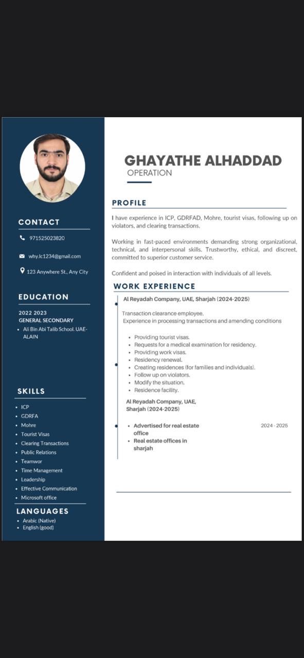 باحث عن عمل لدي خبرة في معاملات الإقامة والتأشيرات وخدمات الجهات الحكومية في دولة الامارات. امتلك معرفة شاملة بالاجراءات الرسمية، ادخال البيانات، ومتابعة الطلبات بدقة واحترافية. ابحث عن فرصة عمل ضمن شركة خاصة في مجال الخدمات الادارية، تخليص المعاملات، أو ادخال البيانات، مع الالتزام بالسرعة، الدقة، وحسن التعامل مع العملاء