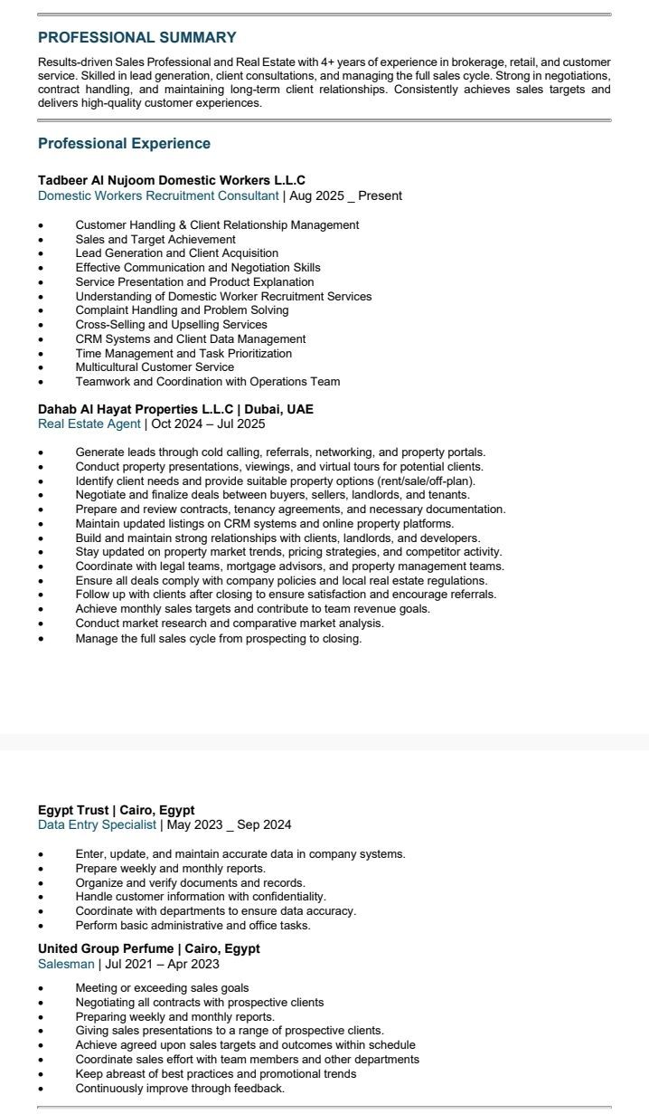 لدي خبرة في مجال السيلز والماركتينج وخدمة العملاء، أجيد التعامل مع الكمبيوتر وبرامج الأوفيس، وأسعى للحصول على فرصة عمل مناسبة داخل الامارات. جاهز للعمل فورا وقابل للتطوير