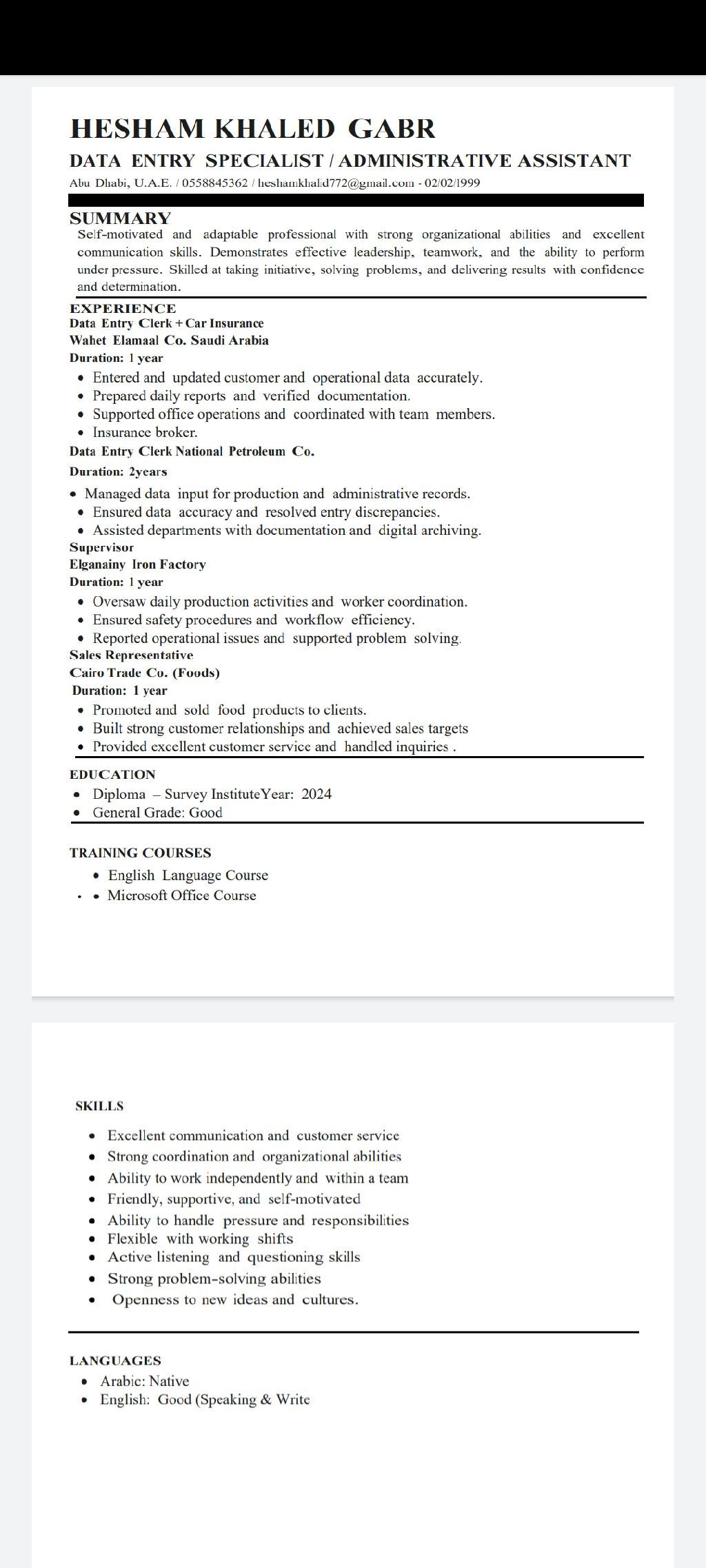 My name is Hisham Khaled Gabr, I am 26 years old. I have worked in several fields during my time in my home country of Egypt, including customer service, data entry, sales, and general supervision. I have gained experience and am available for any job in any of the above fields or others. I have the ability to learn new skills as needed, am willing to work in any area, handle work pressure, and c