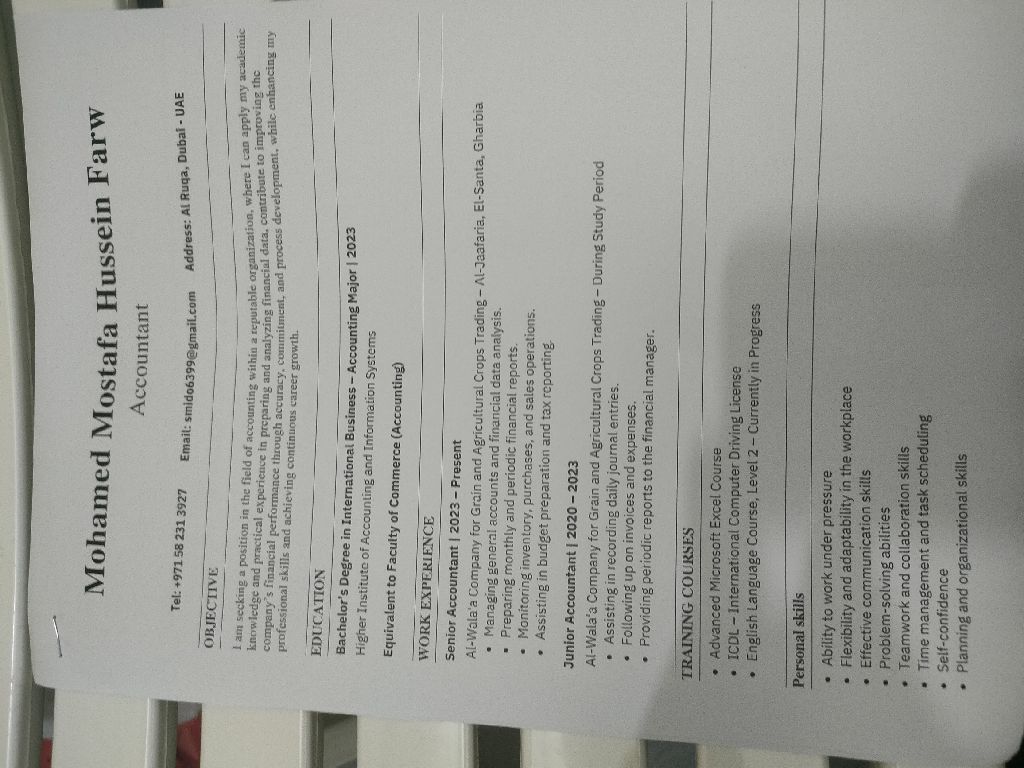 I am looking for a job as a data entry clerk, accounting assistant, cashier, or warehouse keeper, and I am currently located in Dubai, UAE