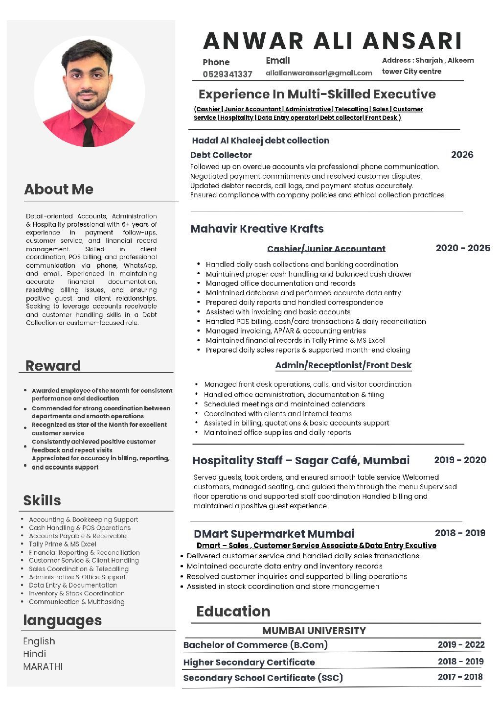 My name is Anwar Ali Ansari. I am from India. Looking for a job change. I have experience in customer service, sales, cashier operations, administration, and multi - tasking roles in fast - paced environments. I have handled billing (POS) cash management, customer coordination, and basic accounting work using Tally Prime. I also have UAE experience in debt collection at Tasheel, managing customer