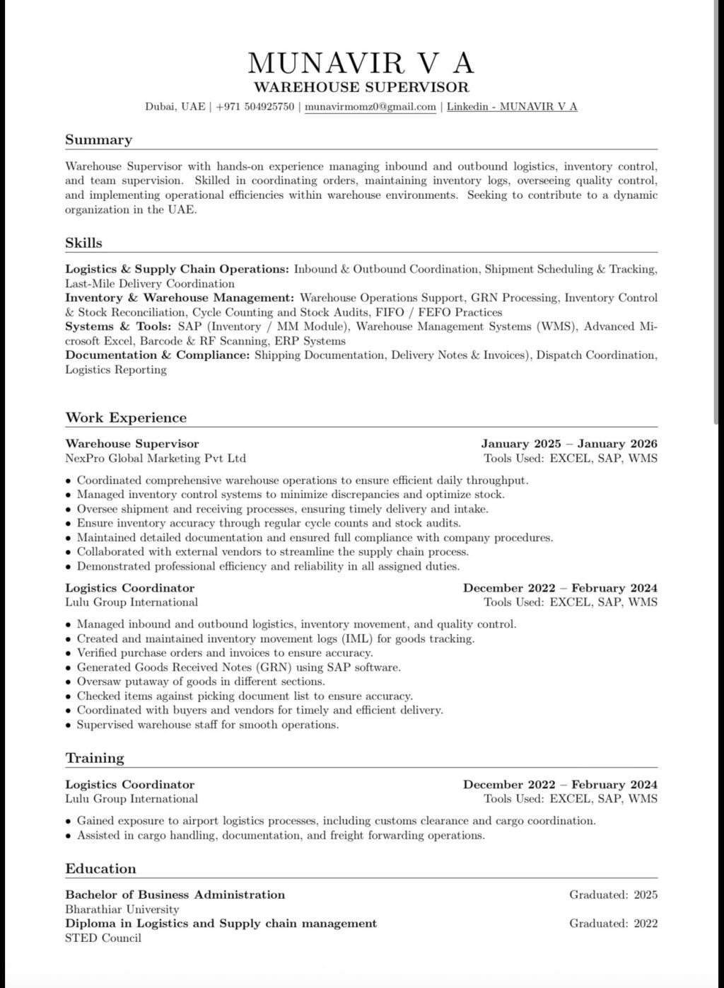 Warehouse Supervisor with hands - on experience managing inbound and outbound logistics, inventory control, and team supervision. Skilled in coordinating orders, maintaining inventory logs, overseeing quality control, and implementing operational efficiencies within warehouse environments. Seeking to contribute to a dynamic organization in the UAE