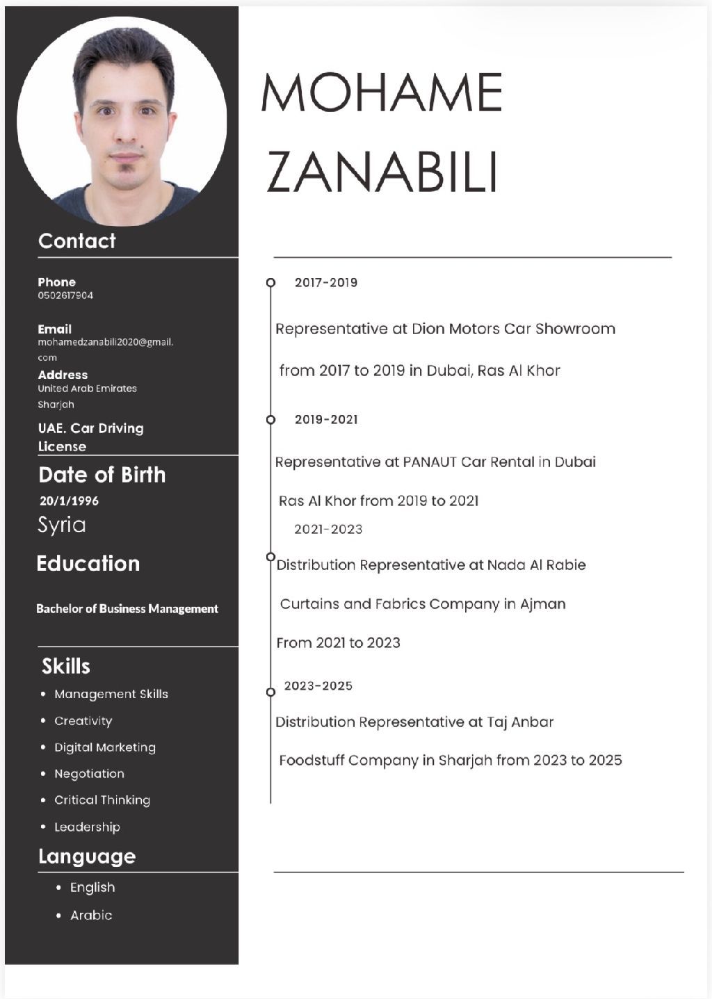 ابحث عن عمل مندوب أو توزيع عمل مندوب في ديون موتورز معرض سيارات من 2017 لي 2019 في دبي رأس الخور عمل مندوب في PANAUT تأجير السيارات في دبي رأس الخور من 2019 لي 2021 عمل مندوب توزيع في شركة ندى الربيع الستائر والأقمشة في عجمان من 2021 لي 2023 مندوب توزيع في شركة تاج عنبر المواد الغذائية في الشارقة من 2023 لي 2025