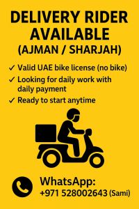 Delivery Rider Available (Ajman/ Sharjah) Description I have a valid UAE bike license (no bike) Looking for daily work with daily pay Ready to start anytime