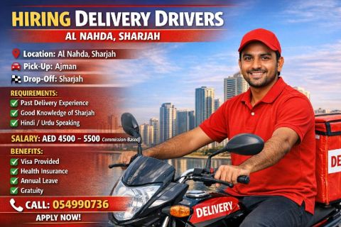 Hiring Delivery Drivers - Al Nahda, Sharjah We are looking for experienced Delivery Drivers to join our team Location Al Nahda, Sharjah Pick - Up Ajman Drop - Off Sharjah Requirements Past delivery experience (Mandatory) Good knowledge of Sharjah roads and areas Hindi/ Urdu speaking (Required) Salary AED4500 - 5500 (Commission - Based) Benefits Visa Prov