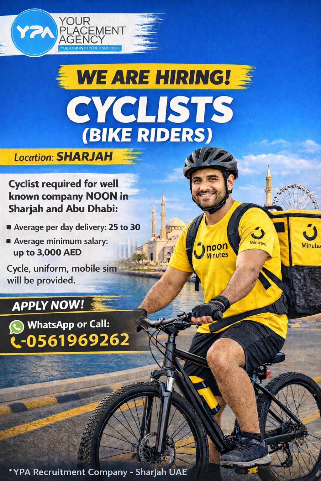 We are hiring cyclist for NOON minutes in Sharjah and Abu Dhabi with attractive salary and benefits. Cycle, uniform and sim will be provided