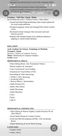 Motivated Junior Front - End Developer and Video Editor with a strong foundation in HTML, CSS, Bootstrap, and JavaScript, alongside hands - on experience in video editing and content production. Eager to contribute creativity, technical skills, and a strong willingness to learn in a professional environment