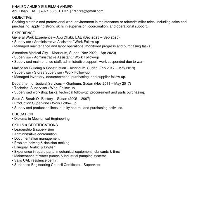 Looking for a supervisory job in companies and warehouses, factories, cars, spare parts spare parts, lubricants, and oils tires and mechanical equipment Maintenance Supervisor 13 years proficiency in technical drawing and follow - up General worksOr the field of sales and purchases two years or assistance Administrative or any related job. To contact on the