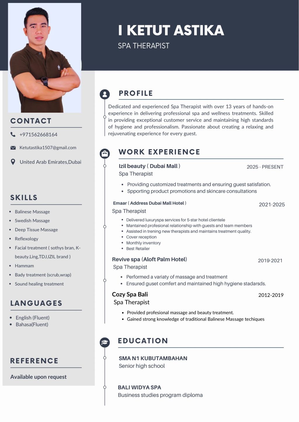 Spa Therapist with over 13 years of extensive experience in luxury hospitality, specializing in delivering exceptional wellness treatments and personalized guest experiences within 5 - star hotels