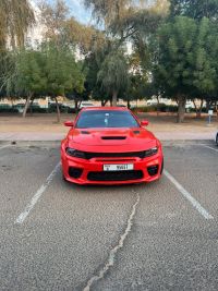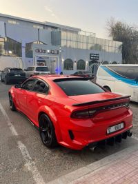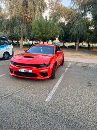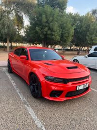 Dodge Charger, orange color, 2020 model, full specifications, no sunroof. The car is in excellent condition with 138,000 km mileage. Price: 48,000 AED.