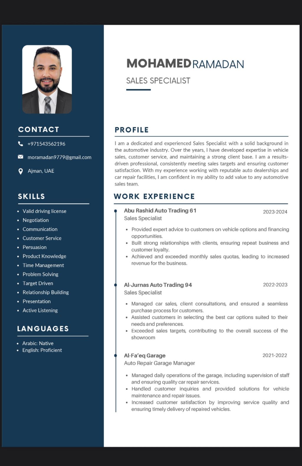 اسمي محمد 34 سنة مصري الجنسية أحمل ليسن خفيف ومعي إقامة وكنت اعمل بمجال السيارات خبرة من 2021 بيع وشراء في سوق سيارات عجمان ابحث عن عمل في مجال السيارات أو مكتب تأجير سيارات