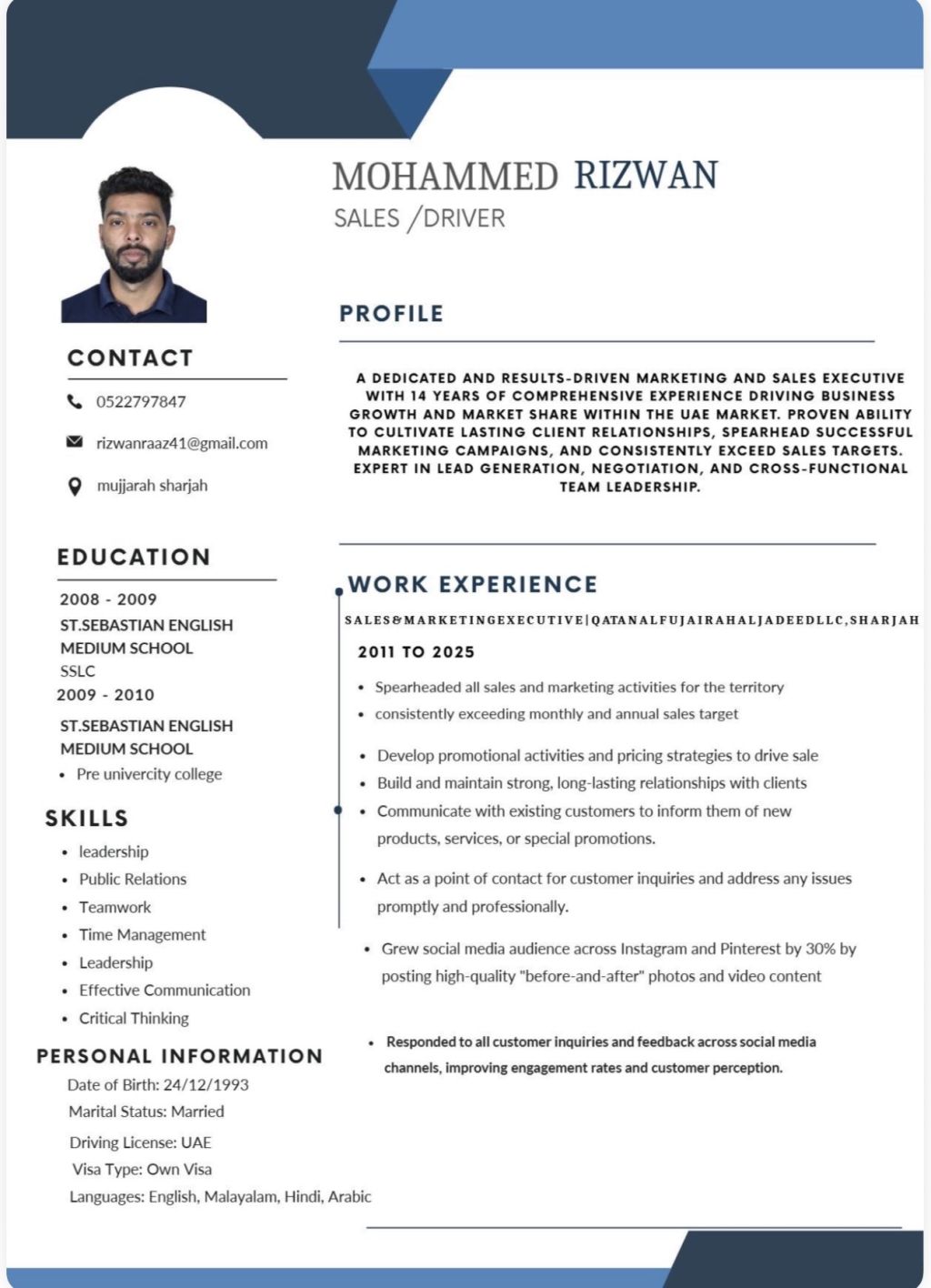 Sales & MARKETINGEXECUTIVE QATANALFUJAIRAHALJADEEDLLC, Sharjah - 2011 TO 2025 - Spearheaded all sales and marketing activities for the territory - consistently exceeding monthly and annual sales target