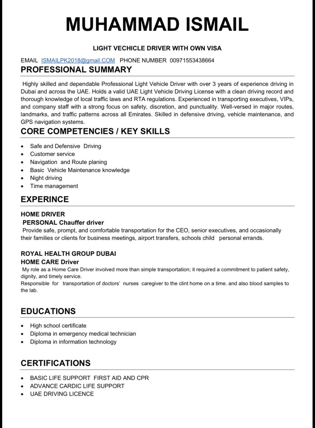 سائق مركبة خفيفة بخبرة تزيد عن 3 سنوات في دبي وجميع امارات الدولة. متمكن من الطرق والقيادة الآمنة والدقيقة، ولديه خبرة في توصيل المدراء والموظفين والطاقم الطبي. يحمل رخصة قيادة اماراتية وجاهز للعمل فورا