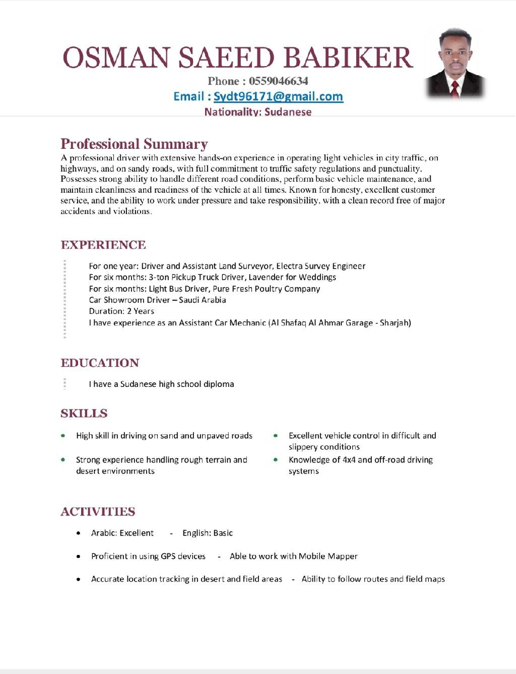 اسم عثمان أنا ابحث عن فرصة عمل كسائق لدى شركة أو عمل خاص. امتلك خبرة في القيادة، بالاضافة الى خبرة عملية كمساعد ميكانيكي سيارات، ومساعد مساح أراضي. ملتزم بالعمل، حسن السيرة، أتحمل ضغط العمل، وابحث عن عقد عمل محترم واستقرار وظيفي. جاهز للعمل فورا، والتعاون على المدى الطويل