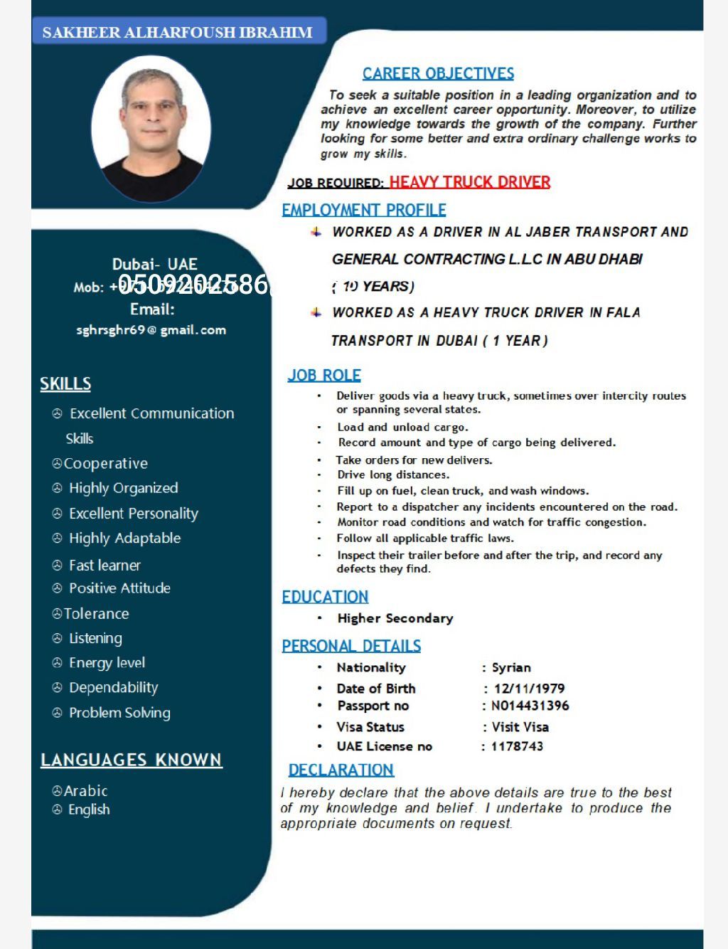 سائق ثقيل موجود في دبي، يبحث عن عمل يحمل الليسن الثقيل الاماراتي من عام 2007 خبرة في الدولة وفي أنواع التريلات والبرادات والستارة وناقلات السيارات نقل داخلي أو خارجي جاهز للعمل فورا