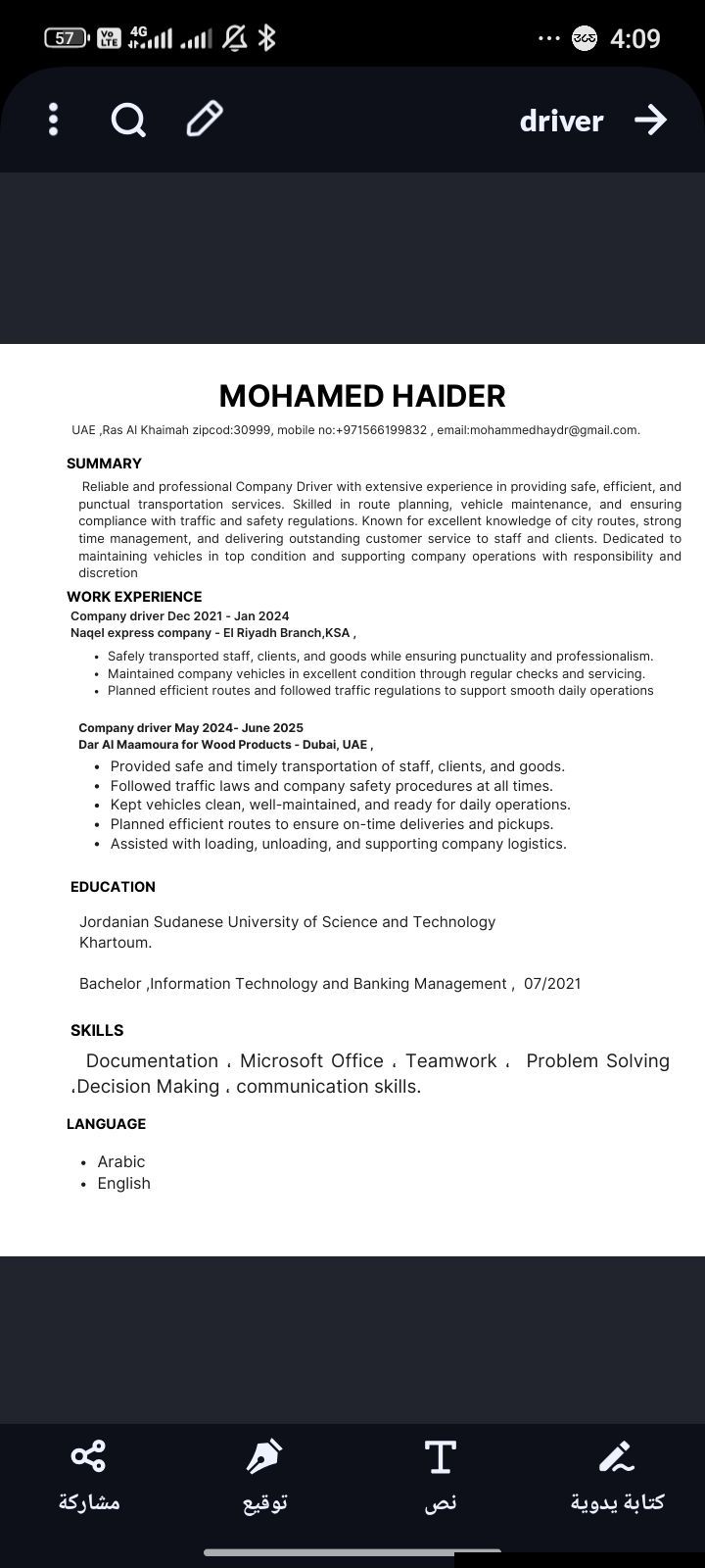 سائق شركة موثوق ومحترف يتمتع بخبرة واسعة في توفير خدمات آمنة وفعالة وخدمات النقل في الوقت المحدد ماهر في تخطيط الطريق وصيانة المركبات وضمانها الامتثال لقواعد المرور والسلامة معروف بمعرفة ه الممتازة بطرق المدينة وقوية إدارة الوقت وتقديم خدمة عملاء متميزة للموظفين والعملاء مخصص ل الحفاظ على المركبات في حالة جيدة ودعم عمليات الشركة بمسؤولية وملخص تقدير خبرة في العمل سائق الشركة ديسمبر 2021