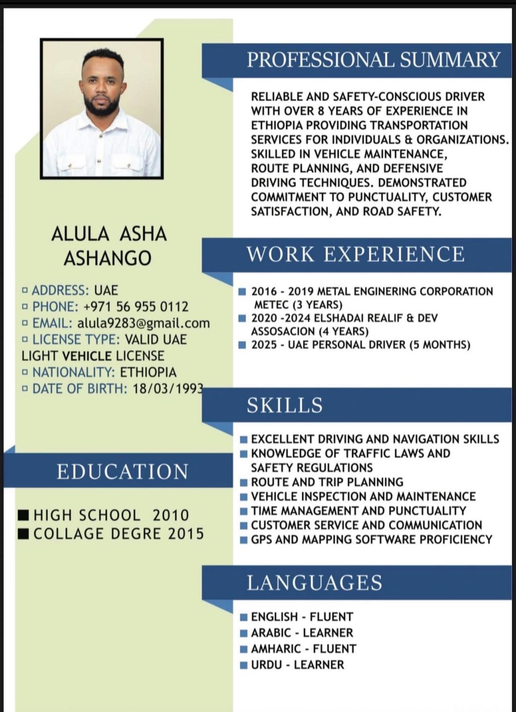 My name is alula Asha I have experience for family driving I am looking a job for family driving I am ready for a joint job. Contact me this