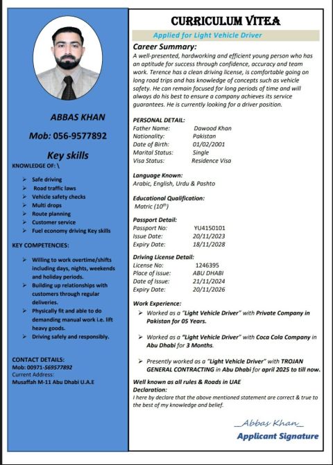 اسمي عباس خان أنا من باكستان ولدي مؤهلات جيدة ومهارات قوية كما انني حاصل على دبلومة DIT، ولدي رخصة قيادة مركبة خفيفة في الامارات العربية المتحدة ولدي تأشيرة عمل حر لمدة عامين اذا كان لديك أي وظيفة مناسبة لي فأخبرني بذلك وسأكون ممتنا لك فمساعدتك الصغيرة يمكن أن تغير مسار حياتي المهنية