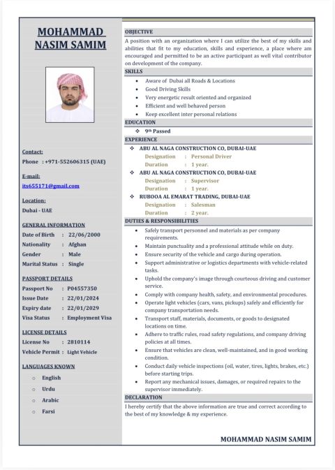 My name is Zahid sultan from Pakistan I am looking for light vehicle driver job I have 14 years work experience and knowledge all UAE roads and policy kindly give me opportunity to work in your team I can join immediately