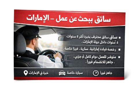A young Sudanese man is looking for a job as a private driver or driver for contracting companies or others. He has a driver's license that has been valid for a year and drives both automatic and manual vehicles. He is currently located in Ajman