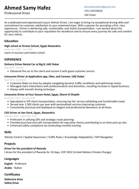 Highly disciplined and focused Driver with over 5 years of combined experience in luxury hospitality and corporate environments. Proven ability to transport families, VIP guests safely and professionally, maintain high - quality service standards, and uphold privacy and confidentiality. Strong background in vehicle maintenance, route planning, and guest satisfaction. Reach out for more details